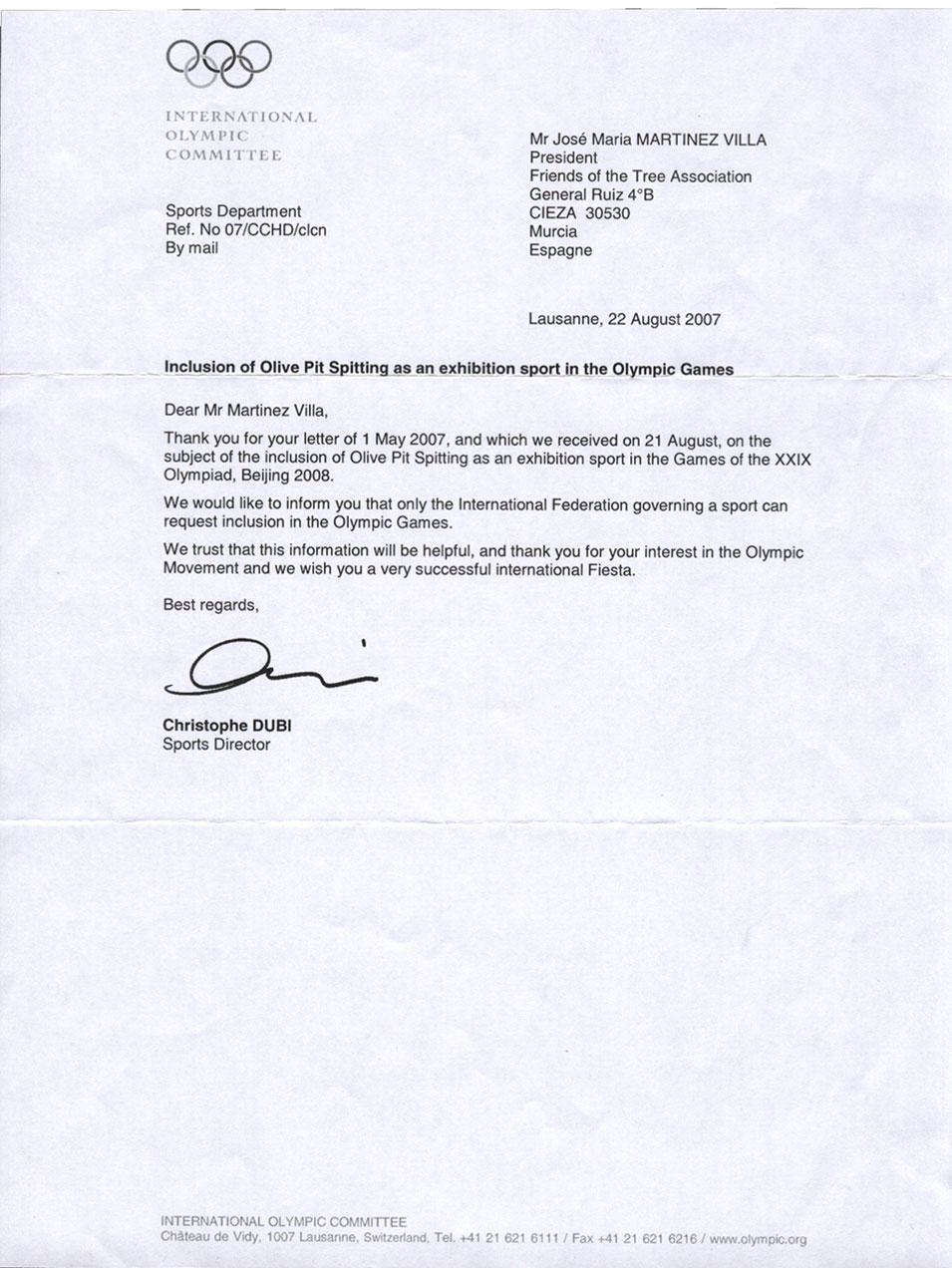 A letter of response soon arrived on the 21rst August. Christophe Dubi, the sports COI director advised the association on the steps to follow in order to make its dream come true. “We would like to inform you that only the International federation governing a sport can request inclusion in the Olympic Games”.